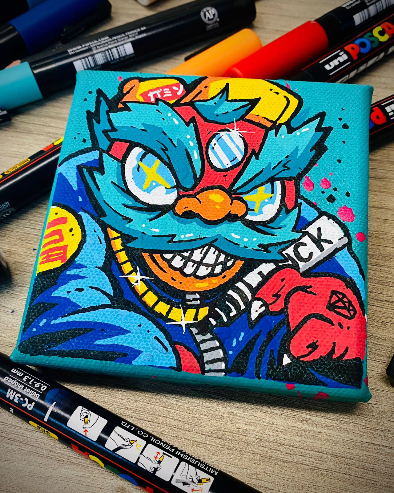 EBAO, DooDon Chan : Rakki, 2025, 10x10cm, Aerosol paint and Acrylic markers on canvas