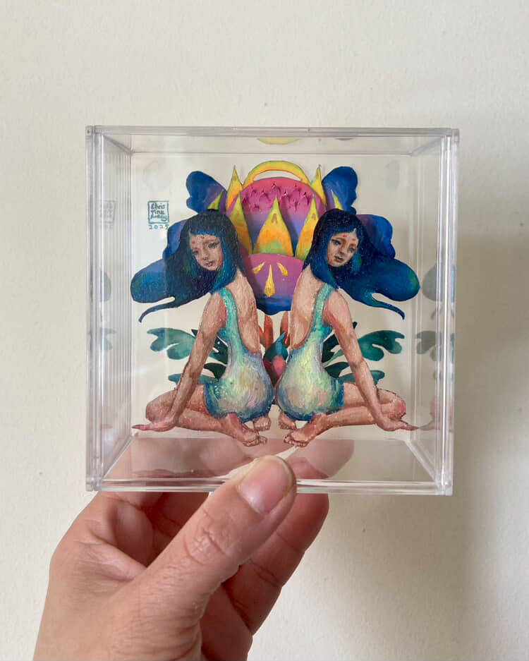 CHRISTINE R. BAY, Song of Eve and Lilith, 2025, 10 x 10 x 4.5cm, Japanese watercolors, acrylics, oils, bamboo paper, Arches paper for oils, silk paper, adhesive, plastic